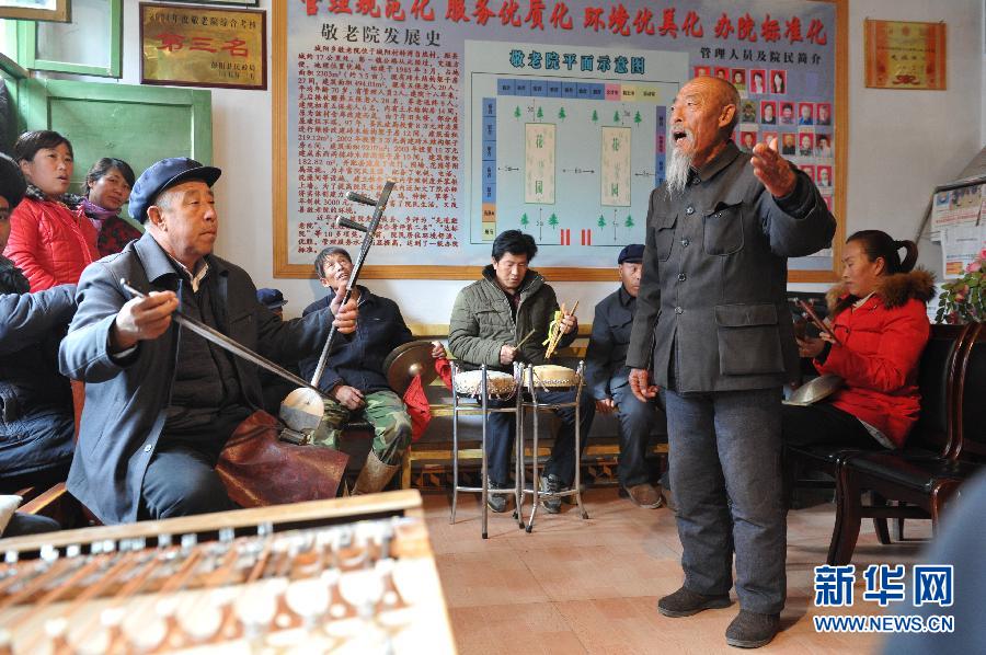 1月5日,剧团成员在城阳乡城阳村演出。冬闲时节,宁夏彭阳县城阳乡一个在当地颇有名气的秦腔剧团开始忙碌起来。在团长白战祥的带领下,这个“草台班子”走村串户,为当地群众义务演出。今年65岁的白战祥年轻时就对秦腔着迷。2002年,他在城阳乡城阳村组建了以演唱秦腔为主的文化大院,聚集了一批和他一样热爱秦腔的当地村民。随着加入人数增多,白战祥将文化大院改组成秦腔剧团。由于剧团成员演出用心,曲目贴近农村生活,逐渐在城阳乡的城阳村、长城村等村唱出了名气,很多村民跨村去看他们的演出。农闲时剧团每周都要去村里演出活动,虽然没有报酬,但白战祥和成员们都乐此不疲。白战祥说:“只要唱起来,大家就都高兴了!” 新华社记者彭昭之摄