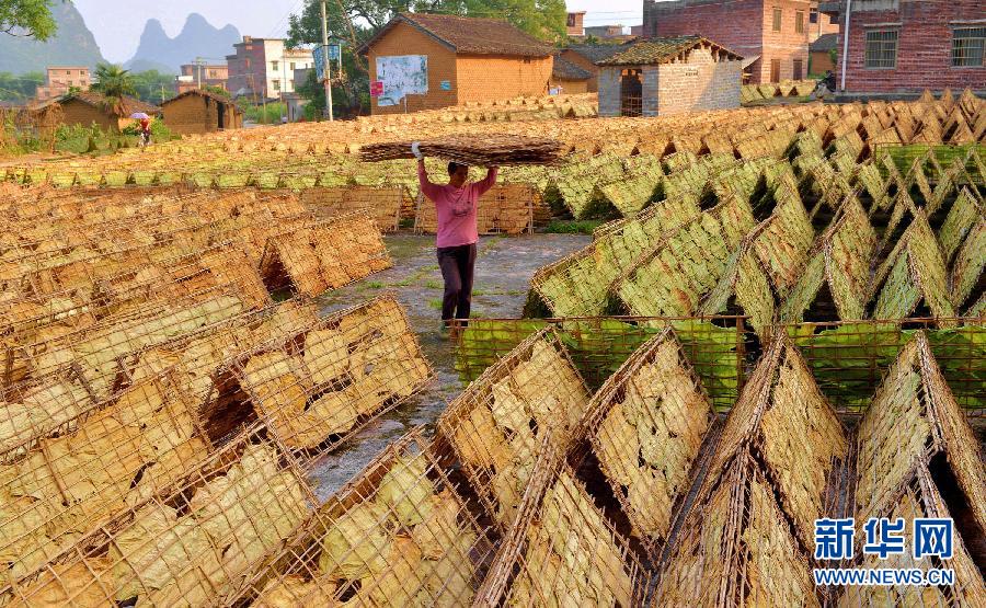 广西昭平县黄姚镇凤立村的烟农在晒烟叶(2014年6月13日摄)。据国家发展改革委消息,自2015年起国家放开烟叶收购价格。由于烟叶收购价是农产品领域最后一个实行政府定价的品种,此举标志着我国农产品价格将全部由市场形成,政府定价彻底退出历史舞台。新华社发(刘飞 摄)