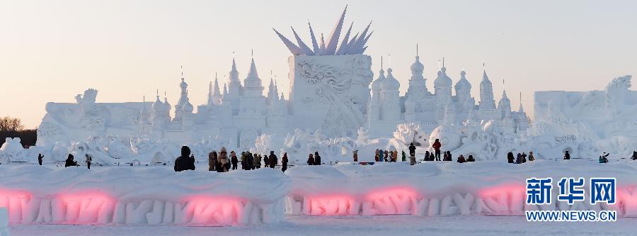 1月6日,游客在太阳岛雪博会主塑《绽放》前游玩拍照。第27届哈尔滨太阳岛国际雪雕博览会的主塑《绽放》于1月5日完成二期雕刻,新增加了俄罗斯建筑、天鹅、祥鸟、冰花等元素。本届太阳岛雪博会主塑采用群雕组合、连续创作、分期雕刻的方式,在不同时期给游客带来不同的视觉享受。目前主塑的主体雕塑长度160米,整个群雕总长度达360延长米,占地1.2万平方米,高达39米。新华社记者王建威摄