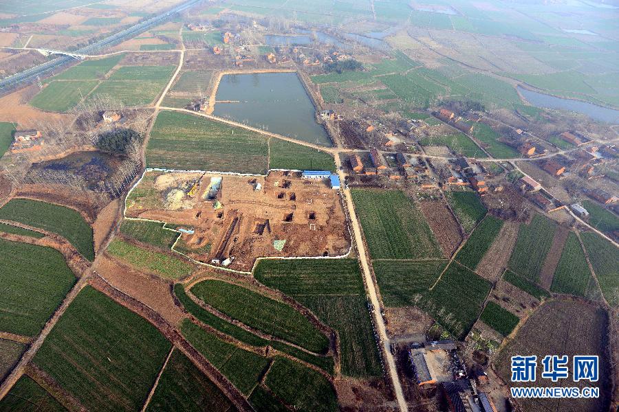 2014年12月30日拍摄的郭家庙墓地发掘区俯瞰图。据湖北省文物考古研究所介绍,近日,湖北枣阳郭家庙墓地发现一个春秋早期乐舞遗存。该遗存出土了目前已知最早的瑟和编钟架等文物,距今约2700多年。郭家庙墓地位于枣阳市吴店镇东赵湖村一、二组,坐落在一条岗地上,南临汉江支流滚河,由北向南绵延,总长1500米,东西宽800米,总面积达到120万平方米,分为郭家庙墓区和曹门湾墓区。新华社发(湖北省文物考古研究所提供)