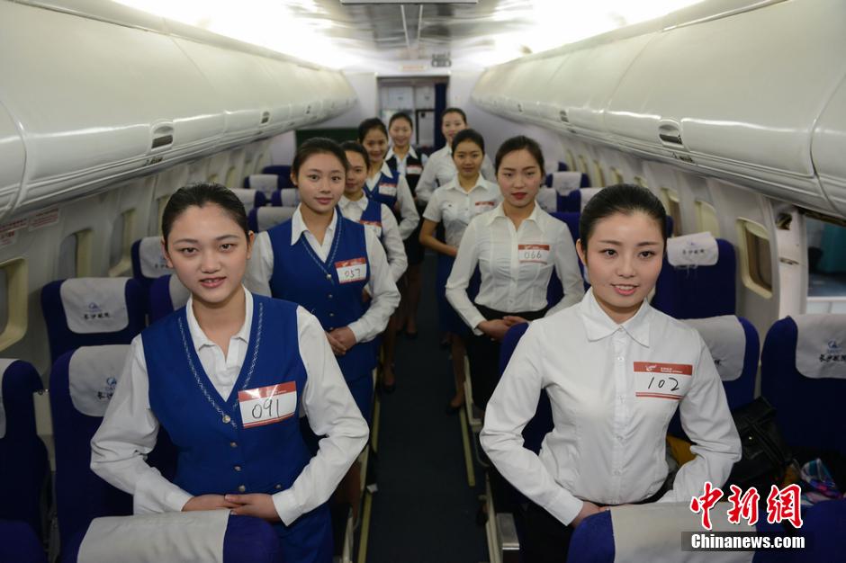 1月7日,近两百名美女学生来到长沙航空职业技术学院参加一航空公司的空乘人员招募。据面试官介绍,面试中,主要是考察学生的外形、体态、亲和力和英语能力,而最看重的则是学生的综合素质。图为面试学生在航空模拟机舱内进行考核。杨华峰 摄