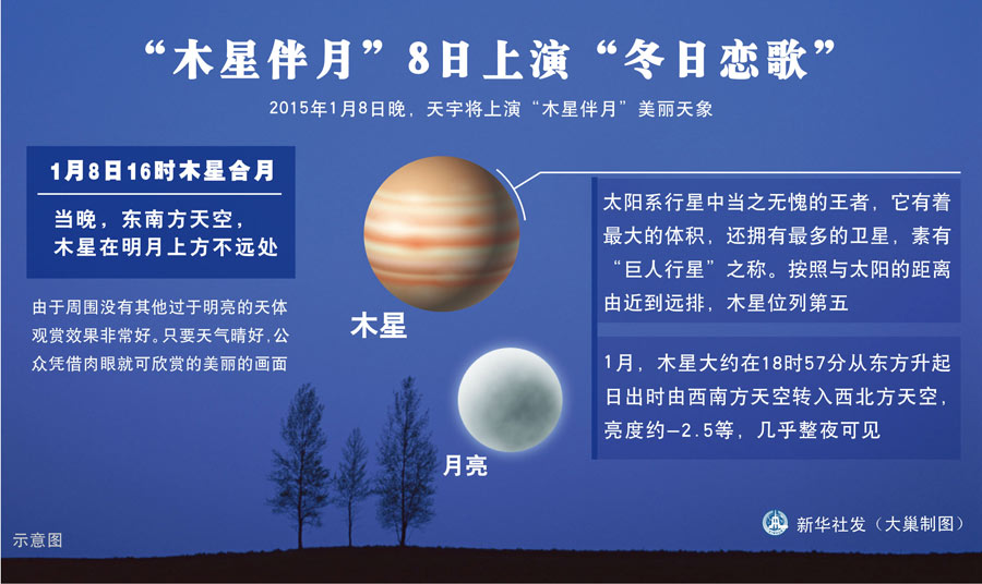 新华网天津1月6日电(记者周润健、朱天骄)1月8日晚,天宇将上演“木星伴月”美丽天象。届时太阳系的“大个子”木星将与“月姑娘”近距离接触,为公众上演一幕浪漫的“冬日恋歌”。