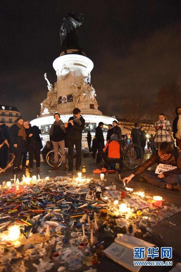 1月7日深夜,一些巴黎民众在共和国广场点燃蜡烛哀悼遭恐怖袭击的遇难者。