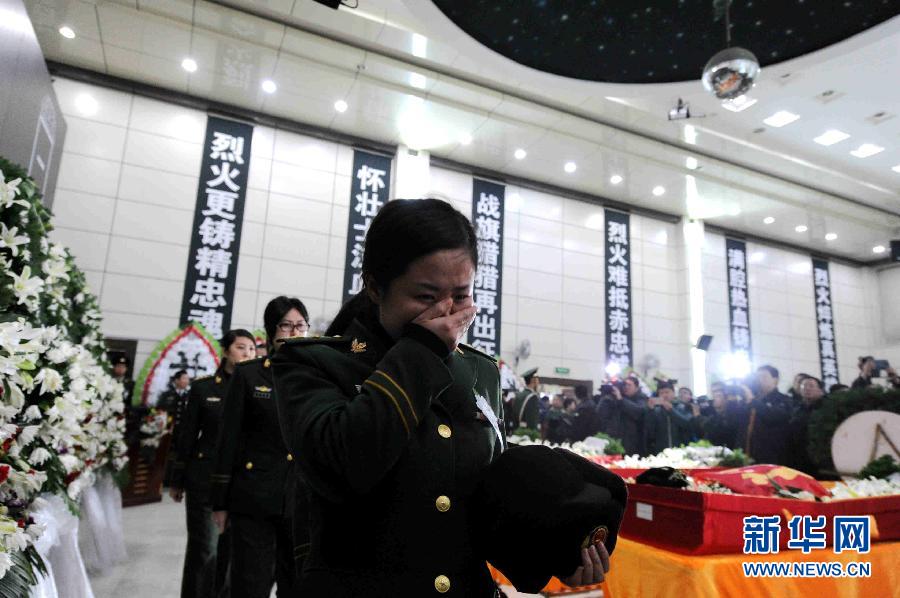 1月8日,武警战士在追悼会上掩面哭泣。当日,黑龙江哈尔滨“1·2”火灾抢险救援中牺牲的赵子龙、傅仁超、张晓凯、侯宝森、杨小伟五名烈士追悼会在天河园殡仪馆举行。新华社记者王松摄