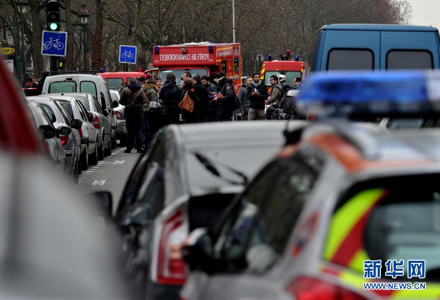 1月7日,在法国巴黎,媒体记者在隔离区采访。位于法国巴黎的《沙尔利周刊》总部7日遭到武装分子袭击,目前已造成12人死亡,另有多人受伤。法国总统奥朗德强烈谴责此次袭击。他在袭击现场说:“这无疑是一起恐怖袭击。”新华社记者陈晓伟摄