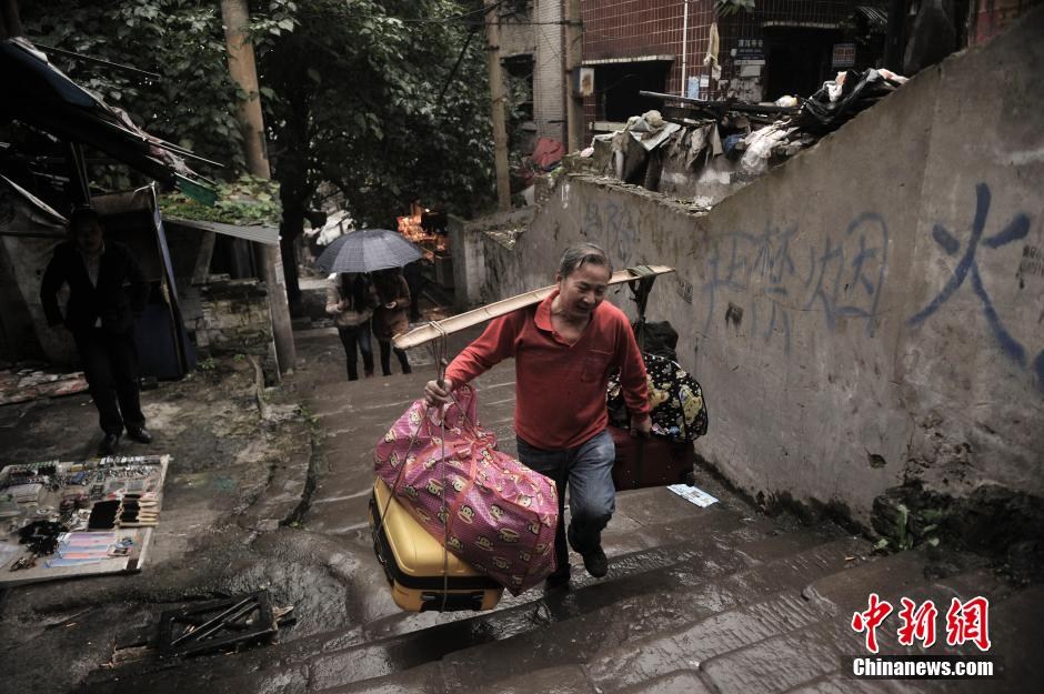 1月8日,“山城棒棒军”还是一如既往的挑着担着穿梭于正在拆迁的重庆老街“十八梯”。老重庆城分为上半城和下半城,十八梯位于渝中区较场口,距离解放碑繁华商业区仅一街之隔,是从上半城(山顶)通到下半城(山脚)的一条老街道。这条老街道全部由石阶铺成,陡陡的,弯弯的,把山顶的繁华商业区和山下江边的老城区连起来。十八梯两旁老旧房屋墙面上几乎都喷着“拆”字,有的已经被夷为平地。图为“山城棒棒军”还是一如既往的挑着担着穿梭于正在拆迁的重庆老街“十八梯”。 陈超 摄