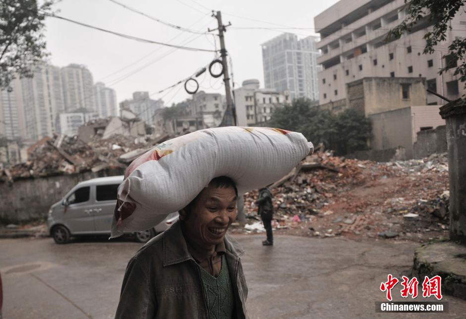 1月8日,“山城棒棒军”还是一如既往的挑着担着穿梭于正在拆迁的重庆老街“十八梯”。老重庆城分为上半城和下半城,十八梯位于渝中区较场口,距离解放碑繁华商业区仅一街之隔,是从上半城(山顶)通到下半城(山脚)的一条老街道。这条老街道全部由石阶铺成,陡陡的,弯弯的,把山顶的繁华商业区和山下江边的老城区连起来。十八梯两旁老旧房屋墙面上几乎都喷着“拆”字,有的已经被夷为平地。图为“老城人”。 陈超 摄