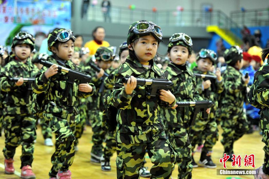 1月10日,福州文博小金星幼儿园的小朋友们身着“海陆空”服饰参加学校一年一度的运动会开幕式,让人眼前一亮。王东明 摄