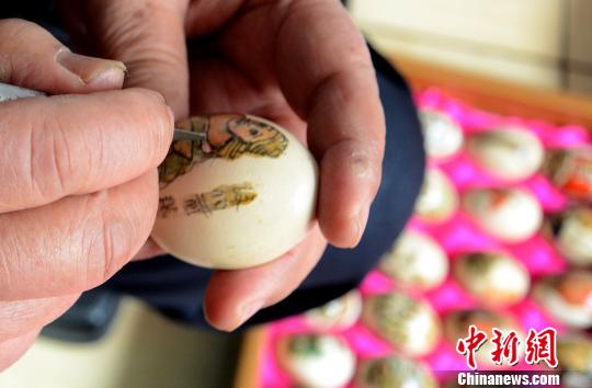 图为老人正在进行创作蛋雕。 黄梦云 摄