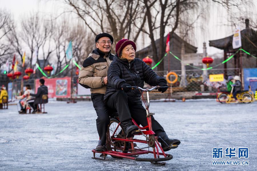 1月11日,两位老人在北京后海冰场上骑着冰车滑行。周末的北京后海冰场游人如织,人们在冬日的暖阳下尽情享受滑冰的乐趣。 新华社发(詹敏 摄)