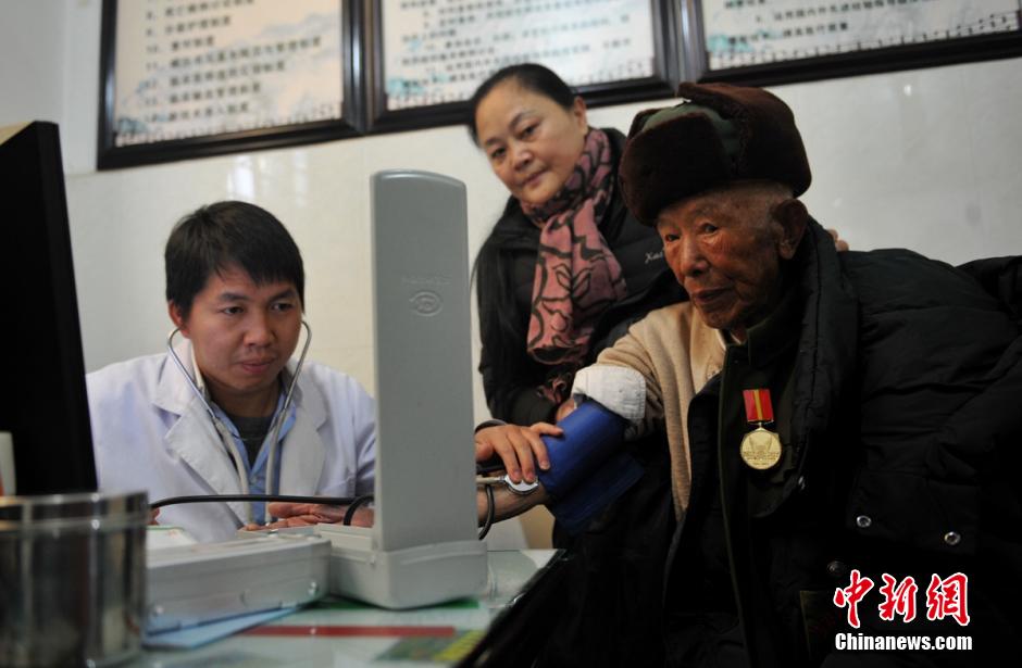 74年过去了,身在异乡的老兵张体留终于可以回到家乡,这让老人感到无比幸福。图为1月6日,张体留老人在县医院检查身体看看是否能乘坐飞机。钟欣 摄
