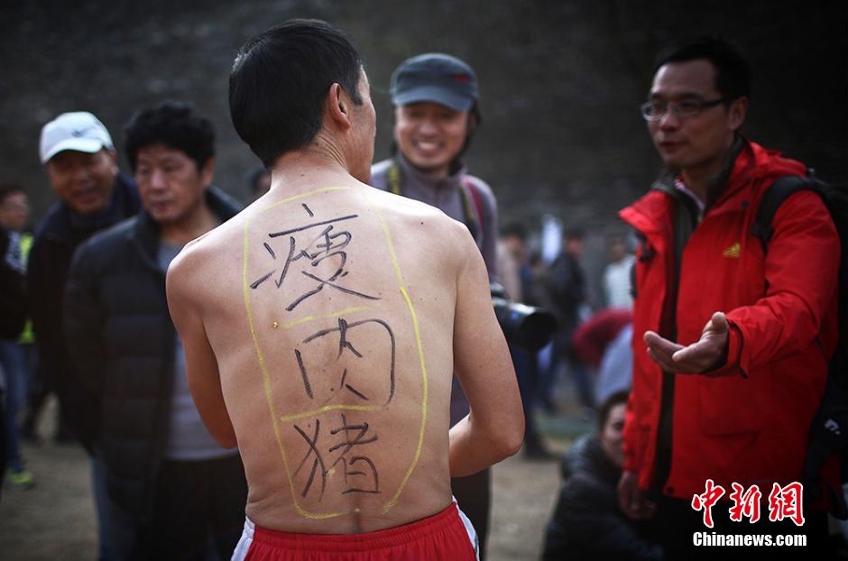 1月11日,一场由网友自发组织、主题为“勇敢做自己”的“光猪跑”比赛在南京玄武湖畔举行,三百多位当地跑步爱好者以近乎“裸奔”的方式快乐奔跑,以独特的方式倡导人们快乐生活、亲近自然的理念。“光猪跑”起源于欧美,近几年逐渐在国内风靡,参与者须脱去外衣只穿内衣裤“裸跑”,所以被戏称为“光猪”,比赛也因此得名“光猪跑”。泱波 摄