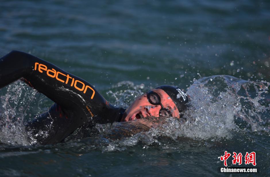 1月11日,来自9个国家的58名冬泳选手齐聚青海贵德县,角逐第五届中国青海国际(冬季)抢渡黄河极限挑战精英赛。本届挑战精英赛为同类赛事中海拔最高、游距最长,水流最急、参赛难度最大,是其它公开水域冬泳比赛无法相比的,被誉为“冬泳爱好者的极限运动”。中新社发 胡贵龙 摄