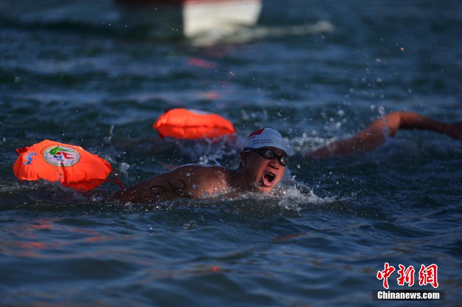 1月11日,来自9个国家的58名冬泳选手齐聚青海贵德县,角逐第五届中国青海国际(冬季)抢渡黄河极限挑战精英赛。本届挑战精英赛为同类赛事中海拔最高、游距最长,水流最急、参赛难度最大,是其它公开水域冬泳比赛无法相比的,被誉为“冬泳爱好者的极限运动”。中新社发 胡贵龙 摄