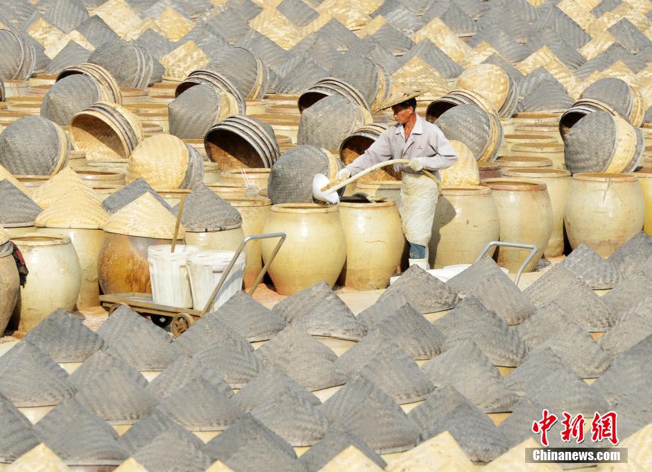 1月11日讯,五万平方米的酱油酿造晒场,近六万口传统酱缸,场面壮观的厦门酱文化园每天都吸引许多中外游客前游玩。据了解,厦门古龙酱文化园是国内首个以酱为主体的文化园,是由厦门古龙食品有限公司的4.4万平方米酱油酿造晒场改造而成的。这个酱文化园拥有55559个传统酱缸和多个展厅,不仅以3D电影的方式展现了从唐代传承至今的闽南制酱工艺,还能让游客亲自动手制酱,体验一回逛酱园、制酱油、“打酱油”的乐趣。开园一年多来,已迎来十几万游客,成为厦门工业旅游新景点和示范点,也成为传承和了解中国酱文化的一个窗口。图为1月10日,工人们在酱油酿造晒场用古法酿造技艺酿造调味品。张斌 摄