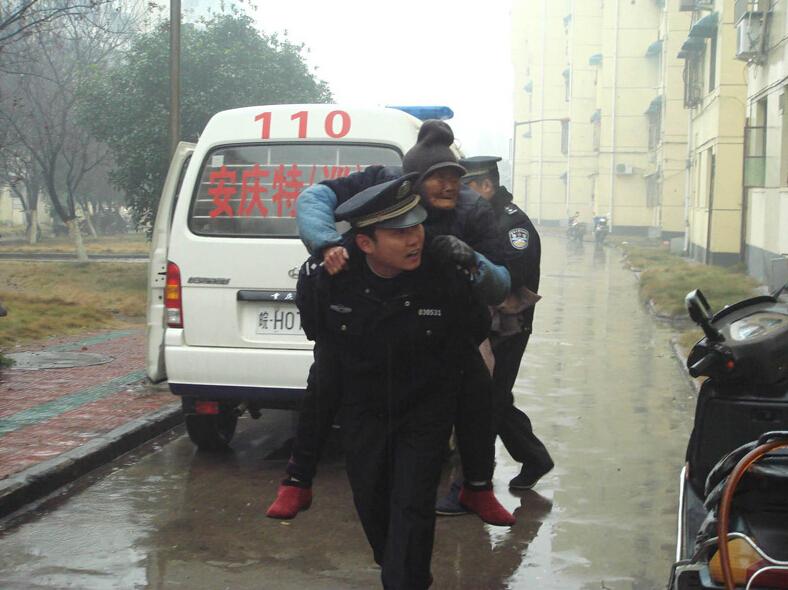 2014年10月26日,安徽省安庆市一居民楼内发生火灾,安庆市公安局110民警紧急疏散火灾现场群众。图片来源:新华网