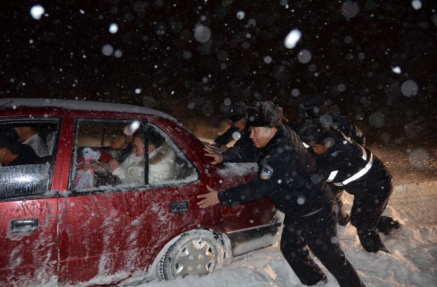 2014年11月25日,一场强降雪袭击黑龙江垦区大地,为保证辖区道路畅通和百姓出行安全,当地公安民警连夜奋战在抗击暴风雪前线。图片来源:新华网