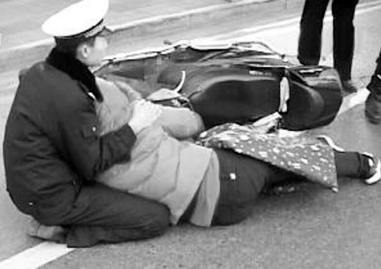 2014年12月20日,南京市民万女士被一辆轿车撞倒在地。21岁的交警四大队协警潘胜达迅速赶到事故现场。万女士因疼痛无法站立,也坐不起来。潘胜达见状,立即单膝跪到冰冷的地面上,让万女士半靠在他身上。潘胜达一边安慰着万女士,一边将情况通报给附近执勤交警。图片来源:新华网