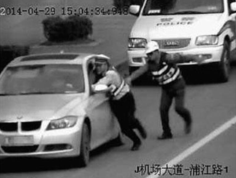 2014年4月29日,浙江省温州市交警支队民警蒋云磊对车辆进行例行检查时,发现一辆银色宝马车驾驶员神情很紧张。蒋云磊查明该车驾驶员杜某系逃犯后,立即示意其下车配合检查。这时,杜某突然猛踩油门逃窜。蒋云磊扒住车窗,搏斗中奋力右打方向盘,迫使宝马车偏向路边并将其成功逼停。图片来源:新华网