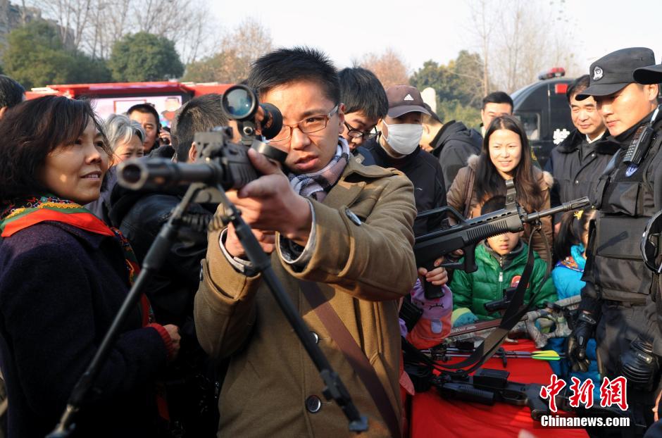 1月10日,现场的防爆装备、排爆器材等装备展示备受热捧,市民零距离体验。当日,安徽合肥警方在合肥杏花公园开展110宣传日亲民活动,各种特警武器展示、警用防爆突击车、防爆罐同“警犬模特”一起与合肥市民“零距离”接触。中新社发 韩苏原 摄