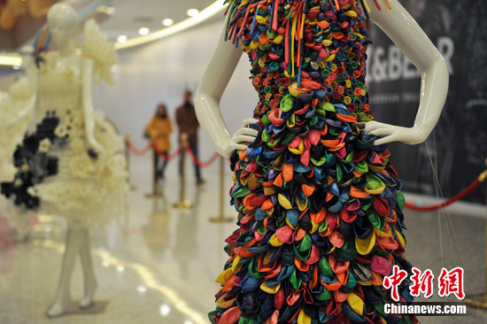 1月8日,昆明一购物中心内,商家用上万颗气球打造了一件“另类”婚纱,吸引顾客眼球。 中新社发 任东 摄