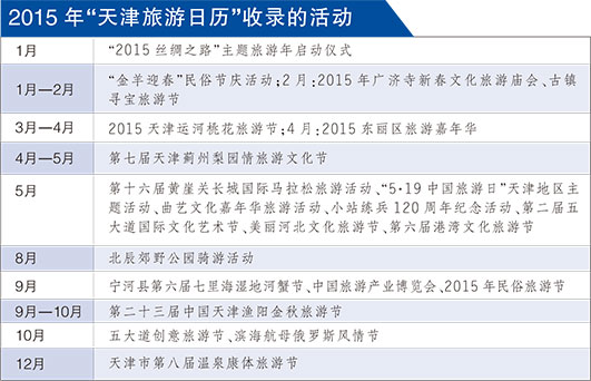 记者从天津市旅游部门了解到,天津市首次推出了2015年“天津旅游日历”,将全年20余个重要节庆、节点活动收录其中,以方便海内外游客安排在天津的旅游行程。(张鸣岐)