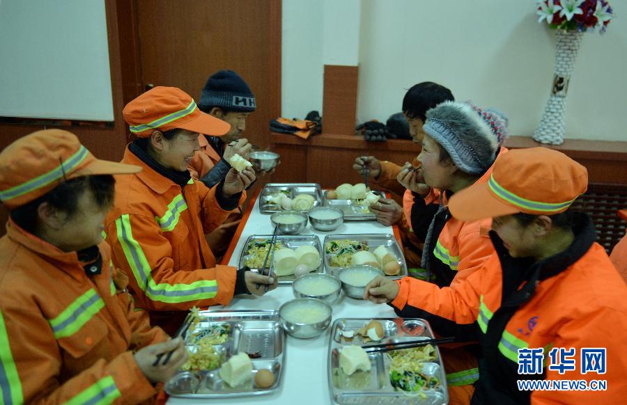 1月12日,在兰州市城关区亚太慈善定西路餐厅,几名环卫工人坐在一起吃早餐。为了解决环卫工人、留守儿童、孤儿、孤寡老人吃早餐难的问题,由兰州工商总会发起,甘肃亚太慈善基金会出资,于2014年3月在兰州市城关区定西路和安定门各开办一家慈善早餐店,每天提供免费营养早餐800余份。新华社记者 范培珅 摄
