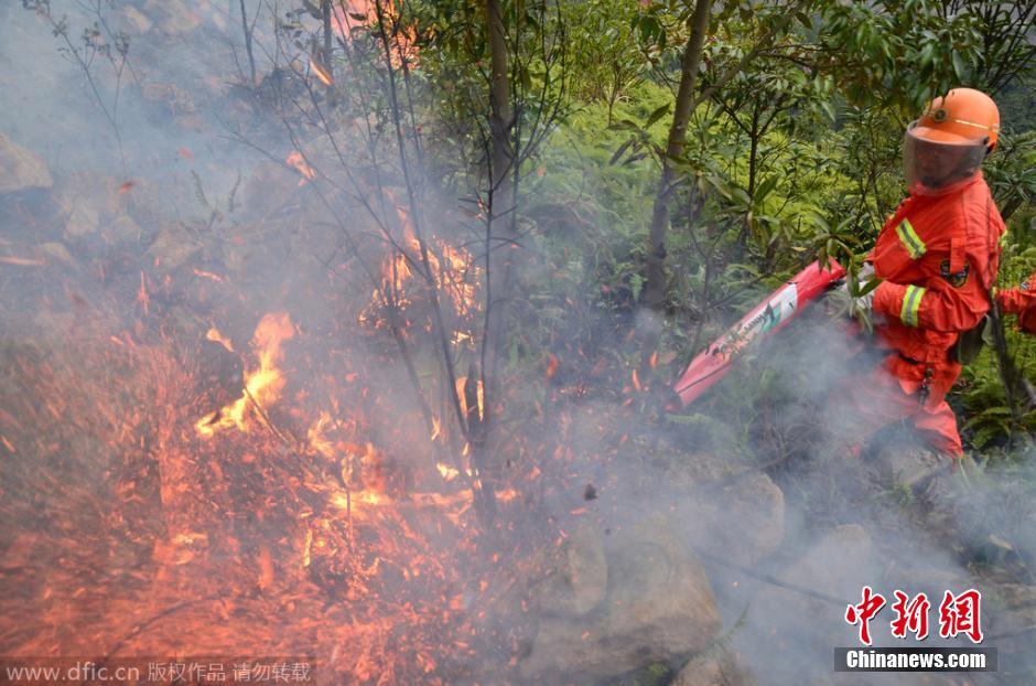 2015年1月12日上午,浙江温岭市城南镇沿坑、大田村山头,森林消防队员正在扑救山火。清晨,浙江温岭市城南镇沿坑村、大田村、竹坑村多处山头失火,由于天干物杂木众多,加上风助火势,山火带绵延上千米山头,温岭森林消防接警后,调派了辖区上百名森林消防员前往进行扑救,温岭消防大队也派遣出数辆消防车守候在大田村山脚下待命,预防火势蔓延到山脚下民居。图片来源:东方ic