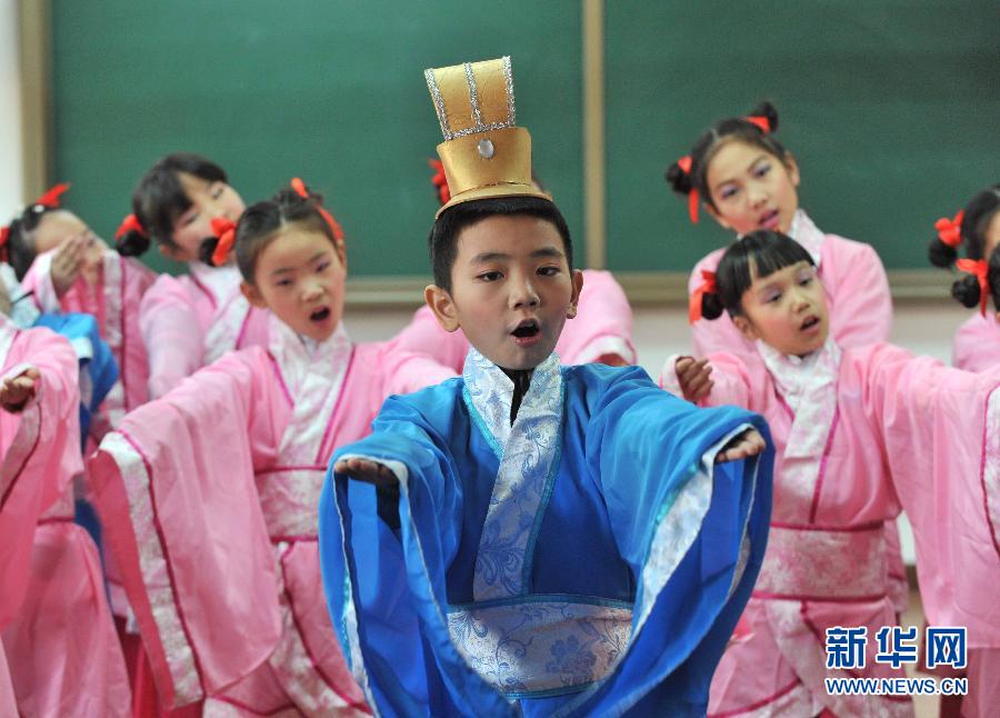 1月12日,身着汉服的定安里小学学生在吟诵诗词。近日,为了增强小学生对国学经典的学习,北京市东城区定安里小学成立了小学生吟诵诗社。学校希望从孩子童幼年开始,就以吟唱的方式诱导他们养成吟诵的爱好和习惯。据了解,东城区定安里小学的学生每天会在学校坚持吟诵20分钟,吟诵内容全部来自经典古诗文。新华社记者 李文 摄