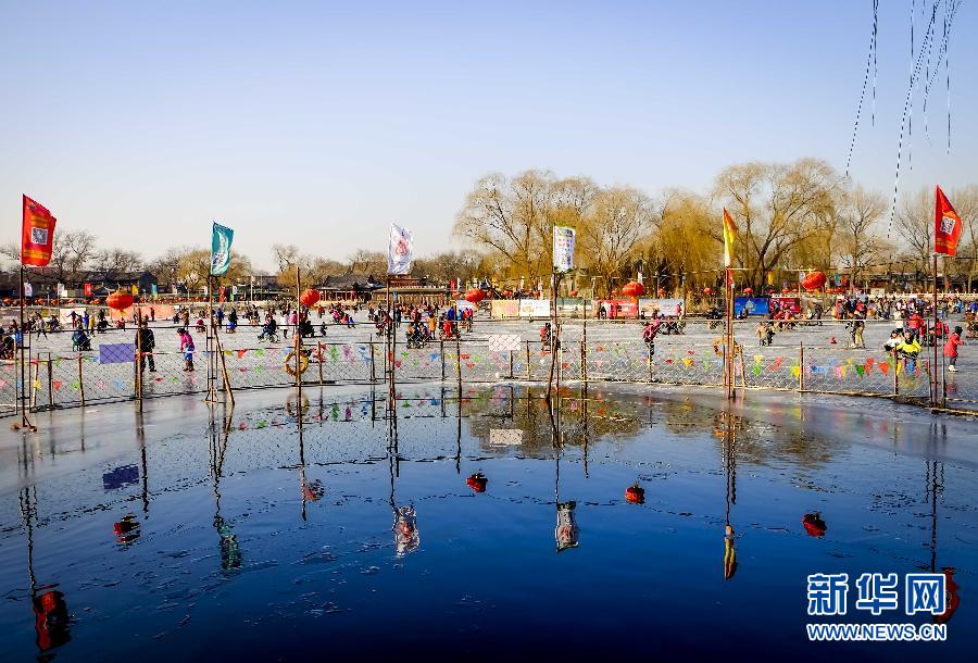 1月11日,游人在北京后海冰场玩耍。周末的北京后海冰场游人如织,人们在冬日的暖阳下尽情享受滑冰的乐趣。 新华社发(詹敏 摄)