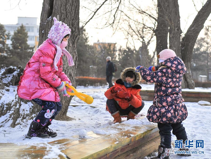 1月11日,几名小朋友在长春市南湖公园内玩雪。寒假伊始,吉林省长春市的一些家长纷纷带着孩子来到户外参与各项趣味冰雪娱乐项目,让孩子们在玩冰戏雪中欢度寒假时光。 新华社记者许畅摄