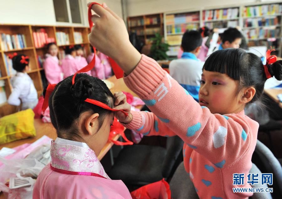 1月12日,定安里小学学生在穿汉服、绑头发。近日,为了增强小学生对国学经典的学习,北京市东城区定安里小学成立了小学生吟诵诗社。学校希望从孩子童幼年开始,就以吟唱的方式诱导他们养成吟诵的爱好和习惯。据了解,东城区定安里小学的学生每天会在学校坚持吟诵20分钟,吟诵内容全部来自经典古诗文。新华社记者 李文 摄