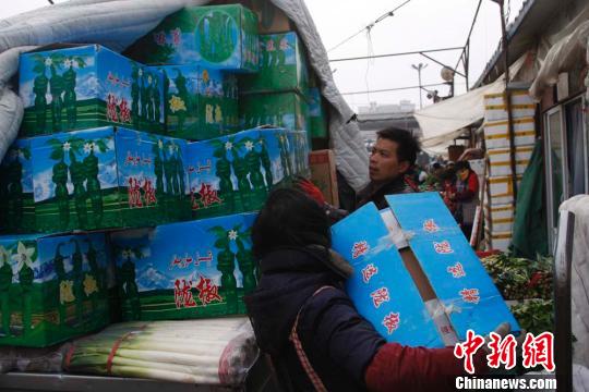 1月12日,内地大量蔬菜进入乌鲁木齐市北园春市场,价格平稳,乌鲁木齐市民争先购买各类蔬菜。王小军 摄