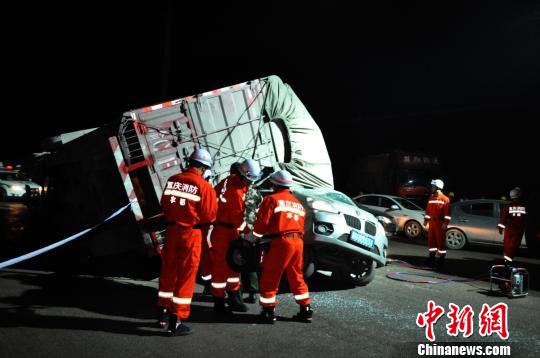 1月11日,重庆丰都县龙河大桥前一辆满载货车侧翻后将一辆面包车压扁,面包车内1人被困。丰都消防大队接到报警后,出动一辆抢险救援消防车、8名官兵赶往现场实施营救。
