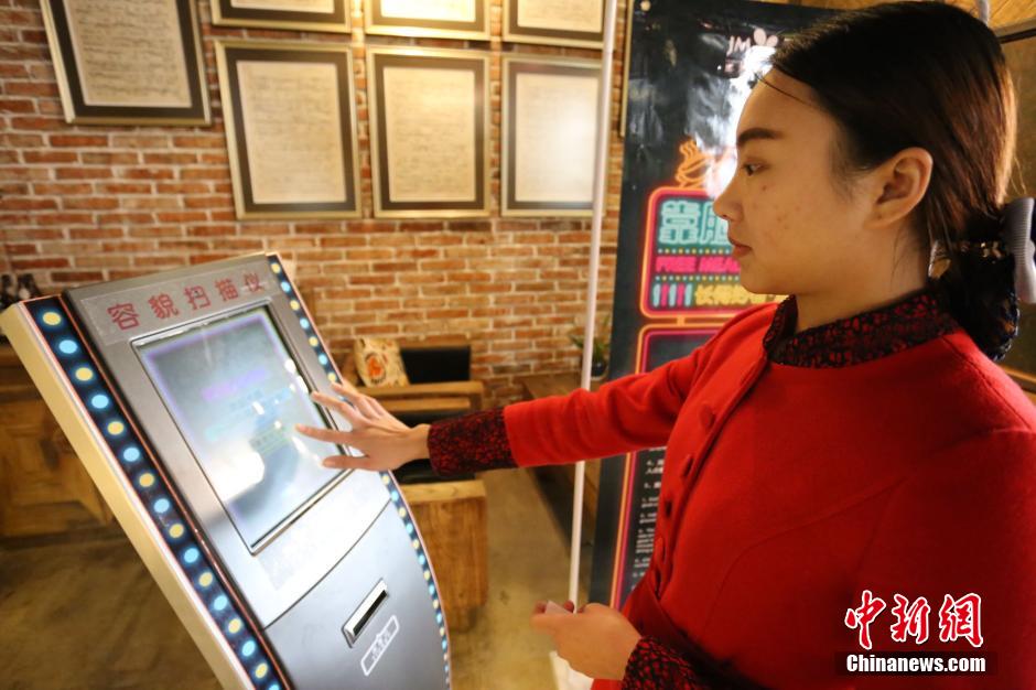 图为1月12日,一名顾客在餐厅电子容貌扫描仪上获取二维码。杨正华 摄