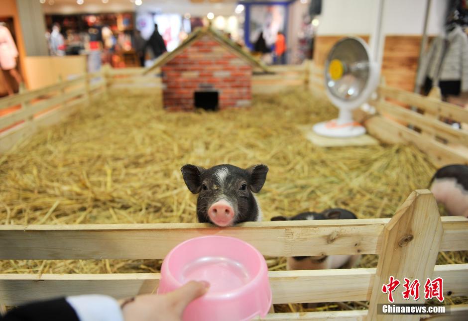 1月12日,一只馋嘴的小猪趴在围栏上期待食物。近日,为吸引顾客,昆明一商场将3只萌态十足的小猪请进商场安家,受到众多顾客的喜爱。 中新社发 刘冉阳 摄