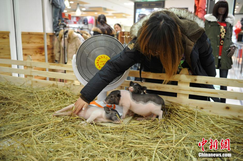 1月12日,小猪正在享受一名女性顾客的“按摩”。近日,为吸引顾客,昆明一商场将3只萌态十足的小猪请进商场安家,受到众多顾客的喜爱。 中新社发 刘冉阳 摄