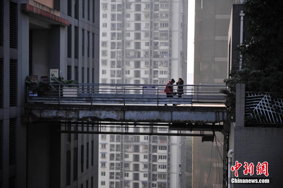 1月13日,不少居民经过12层楼高空中天桥出行。重庆一30余层高的小区楼房,在12楼层处搭起了通向主干道的人行天桥。据悉,该小区多数居民出行都会选择行走该天桥,而少数居民选择从1楼绕行。图为居民经过天桥出行。 陈超 摄
