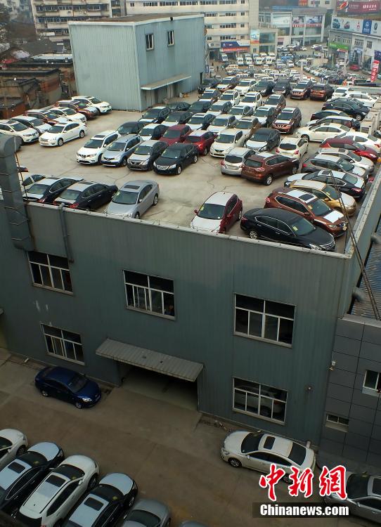 2015年1月13日,湖北宜昌一家4S店开辟楼顶停车场,堆存待售的汽车,成为当地一景。中新社发 刘君凤 摄 图片来源:CNSPHOTO