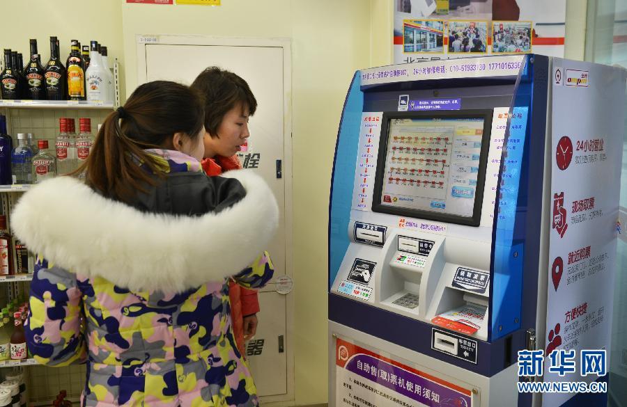 1月13日,在北京市东城区银河SOHO中心的全时便利店,市民使用新开通的火车票自助售(取)票机进行购票。近日,北京铁路局在北京市区的30家全时便利店内安装了30台火车票自助售(取)票机,方便市民就近购取火车票。杨宝森 摄 图片来源:新华网