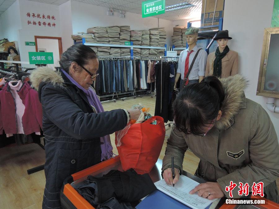 超市里的爱心衣物、鞋子,低保户选好登记即可带走。图为一位大妈为自己和家人选了几件衣服后由超市工作人员清点件数登记。韩章云 摄