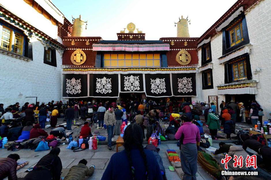 1月13日,信教民众在大昭寺前磕长头。 李林 摄