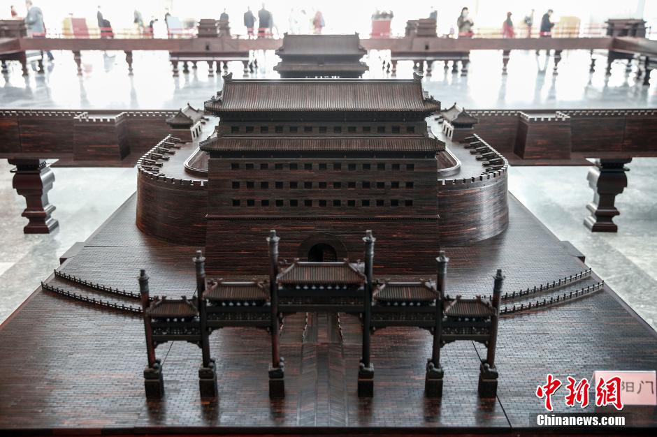 1月13日,大型紫檀组雕作品《九城宫阙》在北京首都博物馆展出。该作品是为纪念北京建城3060周年所做,作品以乾隆时期清宫秘藏《京城全图》为基本蓝本,以世界珍稀的檀香紫檀为材料,耗时七年多,耗料数十吨得以完成。作品东西长18.6米,南北宽16.8米,高1.5米,再现了正阳门等北京内城九大城门的原貌。 中新社发 张浩 摄
