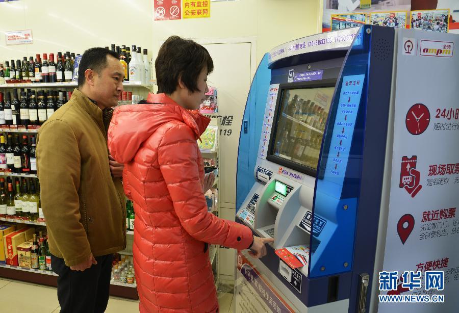 1月13日,在北京市东城区银河SOHO中心的全时便利店,市民使用新开通的火车票自助售(取)票机进行购票。近日,北京铁路局在北京市区的30家全时便利店内安装了30台火车票自助售(取)票机,方便市民就近购取火车票。杨宝森 摄 图片来源:新华网