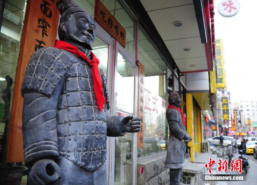 2015年1月13日,辽宁省沈阳市,一对“兵马俑”戴着红领巾在街边一餐馆当迎宾惹热议。