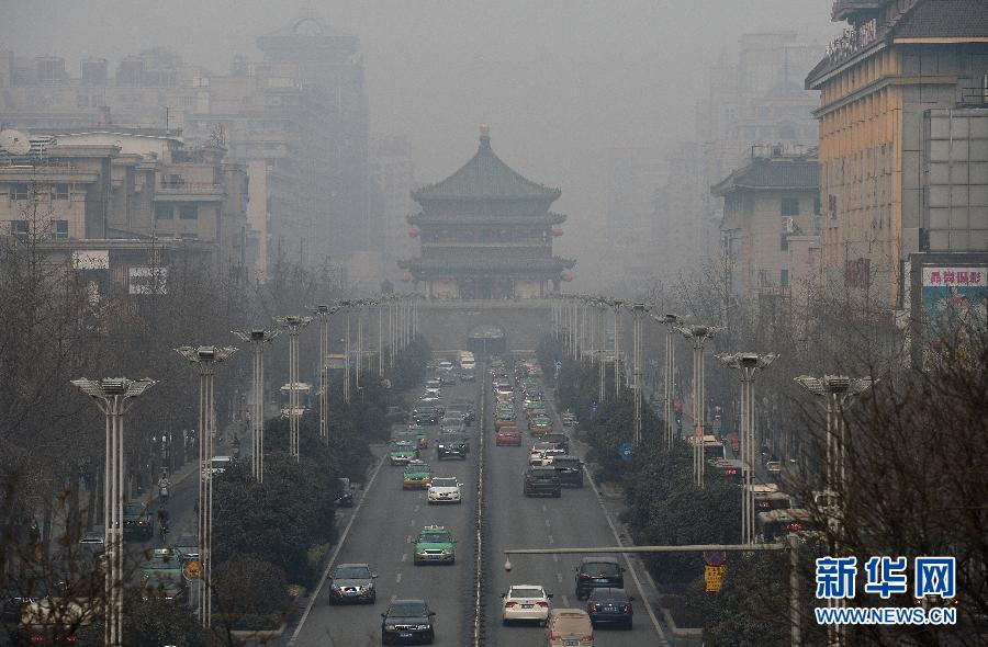 1月13日,西安市区笼罩在雾霾中。当日10时30分,西安市气象台发布霾黄色预警信号。由于地面气温较低,风速较小,预计未来24小时西安部分地区将出现重度霾,易形成中度到重度空气污染。多日来,西安遭遇连续雾霾天气。1月12日,西安市已启动应急响应应对空气污染,除应急抢险及地铁工地外,全市已审批同意作业的所有建设工地一律停止开挖、出土、拆迁、倒土等土石方作业。新华社记者 刘潇 摄