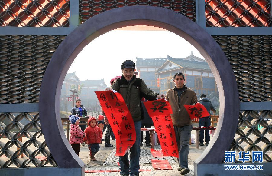 1月13日,在四川省广安市华蓥山区阳和镇偏岩子新村,村民开心地领取书法家为他们撰写的春联和“福”字门贴。连日来,四川省广安市、华蓥市书法家协会参加“我们的中国梦---中国书法家送万‘福’进万家公益活动”的书法家们,组成小分队前往华蓥山区,走村串户为农家义务撰写春联和“福”、“春”等门贴,将“福”送到乡亲们手上。新华社发(邱海鹰 摄)