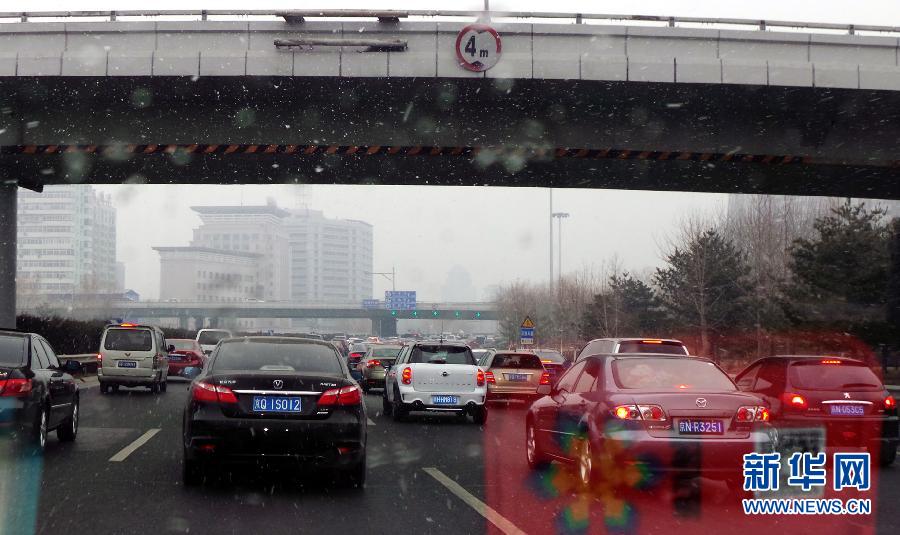 1月14日,车流在北京北四环道路上纷飞的小雪中缓慢行进。当日,北京部分地区迎来小雪,城区有雪花飘落,以零星小雪为主。同时,雾霾仍未消散。气象部门提醒市民出行要注意防霾保暖和交通安全。新华社记者 李明放摄