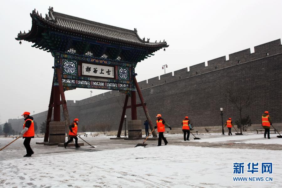 当日凌晨,新年首场大规模降雪悄然而至,润泽古城。 新华社发(陈晓东 摄)