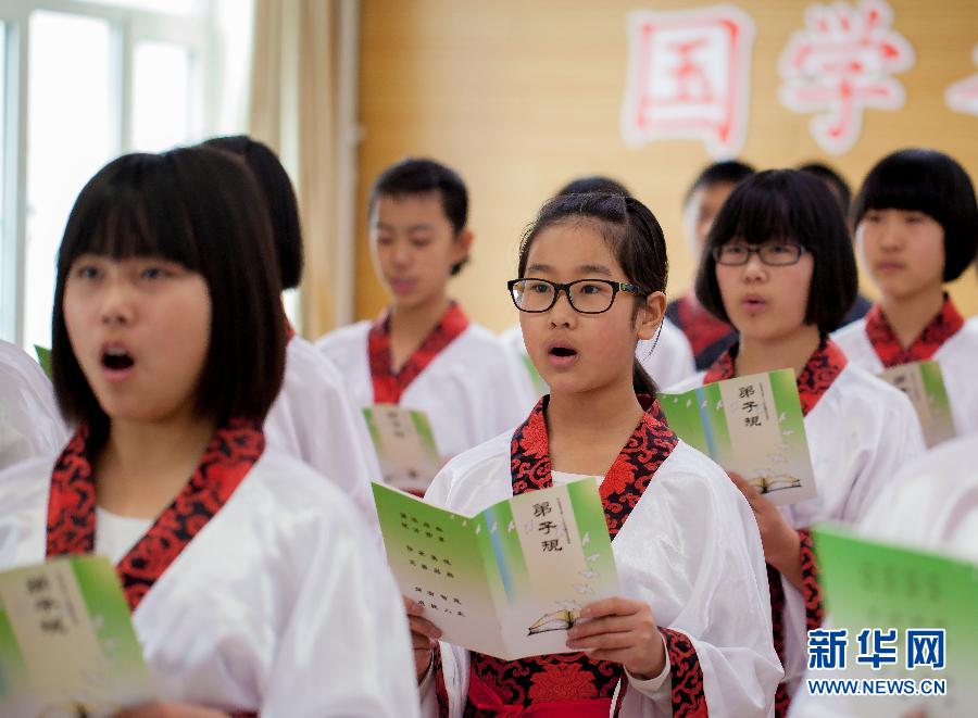 1月14日,参加国学冬令营的中学生在诵读中华典籍《弟子规》。当日,内蒙古呼和浩特市第26中学主办的“国学冬令营儒雅度寒假”传统文化冬令营开营。学生们通过学习《弟子规》《论语》等国学经典,感知国学传统文化的魅力,丰富寒假生活。 新华社发(丁根厚摄)